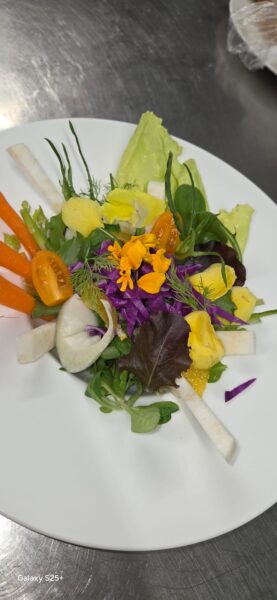 Autumn salad with edible flowers and vegetable dip €10